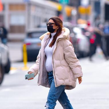 Emily Ratajkowski en jean et doudoune oversize. (New York, le 13 janvier2021.)