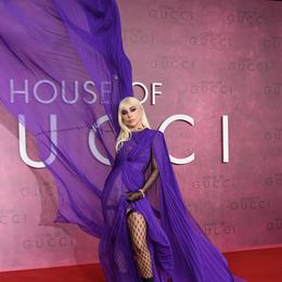 Lady Gaga, éblouissant, dans une robe violette griffée par Gucci pour l’avant-première du film House of Gucci à Londres. (Londres, le 9 novembre 2021.)