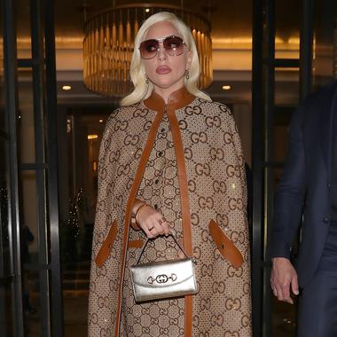 Lady Gaga à la sortie de son hôtel dans un total look monogrammé Gucci. (Londres, le 10 novembre 2021.)
