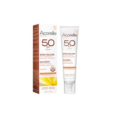 Spray solaire bio SPF50, 100% d’origine naturelle, 22 € les 100 ml, Acorelle. En vente sur www.acorelle.fr.