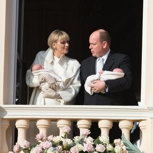 Nés le 10 décembre 2014, Jacques et Gabriella de Monaco se font face sur le balcon du palais princier, lors de leur première apparition publique. (Le 7 janvier 2015.)
