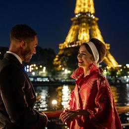 Lucien Laviscount et Lily Collins devant la Tour Eiffel pour la saison 2 d’Emily in Paris.