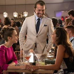 Lily Collins, Ashley Park et William Abadie dans un restaurant pour la saison 2 d’Emily in Paris.
