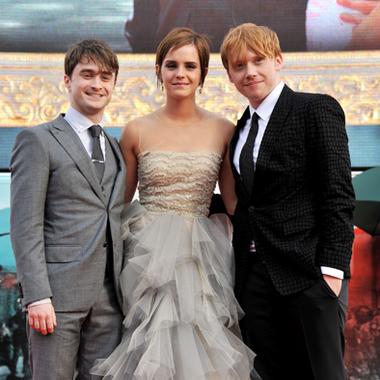 Moment d’émotion pour nos trois apprentis sorciers. Emma Watson (en Oscar de la Renta) est entourée de ses deux amis, Daniel Radcliffe (Harry) et Rupert Grint (Ron). (Londres, 7 juillet.)
