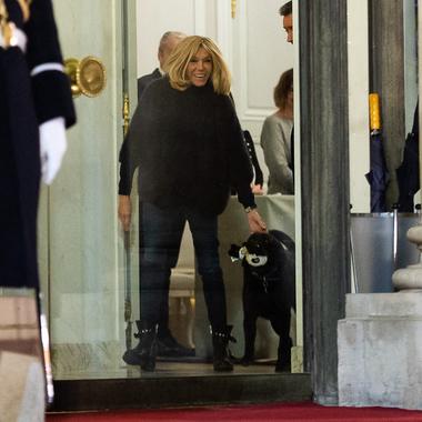 Le (timide) instant de gloire de Nemo, le labrador de Brigitte et Emmanuel Macron. (Paris, le 11 novembre 2019.)