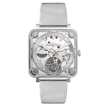 Montre BR-X2 Tourbillon Micro Rotor, 42mm, mouvement automatique. Boîtier en acier poli-satiné, bracelet en maille milanaise, Bell & Ross, prix sur demande. Renseignements sur Bellross.com