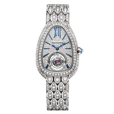 Montre Serpenti Seduttori Tourbillon, 34mm, mouvement manuel. Boîtier et bracelet en or blanc serti de diamants, Bulgari, prix sur demande. Renseignements sur Bulgari.com