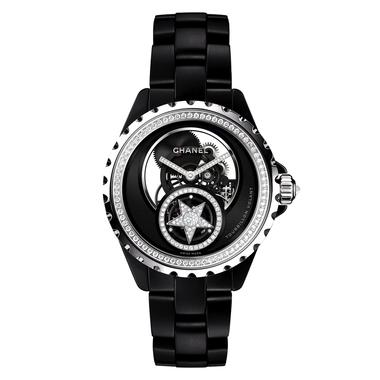 Montre J12 Tourbillon Volant Squelette, 38mm, mouvement manuel. Boîtier et bracelet en céramique haute résistance noire, diamants, Chanel Horlogerie, prix sur demande. Renseignement sur Chanel.com