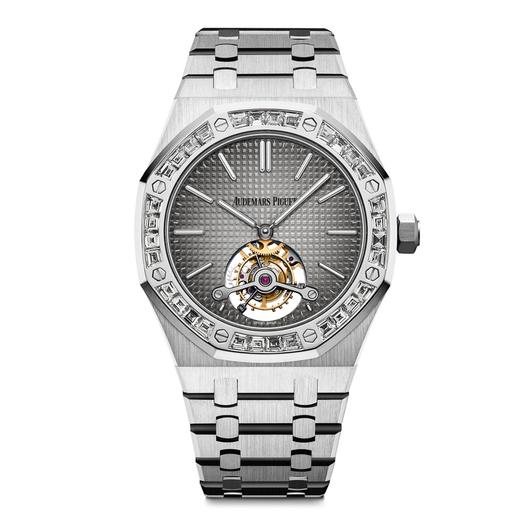 Montre Royal Oak Tourbillon Extra Thin, 41mm, mouvement mécanique. Boîtier et bracelet en acier, lunette pavée de diamants, Audemars Piguet, prix sur demande. Renseignements sur Audemarspiguet.com