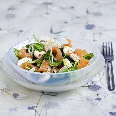 Fraîcheur et simplicité sont les essentiels de cette salade d’épinards au saumon fumé. La pointe rustique de la feuille d’épinard, la texture onctueuse du saumon fumé et le goût noisette des champignons font de ce trio un parfait régal avant le plat de résistance.