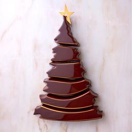Ce sapin a la saveur d’un Noël chocolat-praliné. S’y lovent une mousse aérienne faite d’un grand cru de Panama 72% (le chef François Perret est allé lui-même chercher les fèves de cacao sur place), un praliné d’amandes toastées, caramélisées, délicieusement croquantes et les strates d’un biscuit avec farine. Le long de son glaçage court une guirlande dorée. Une délicate étoile en chocolat brille à son sommet, invitation à la féérie d’un Noël en apesanteur, au pied du sapin d’un des meilleurs chef pâtissiers au monde.