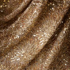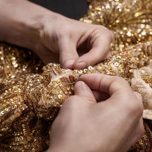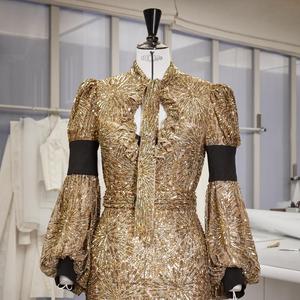 Cette robe longue ceinturée à base de tulle a été entièrement incrustée de 30.000 sequins de tubes et pierres de verre doré. La broderie a nécessité plus de 2800 heures de travail et plus de 10 mètres de tissu. Une production exceptionnelle et personnalisée pour l’actrice qui était également coiffée d’un serre-tête assorti.