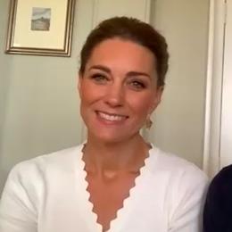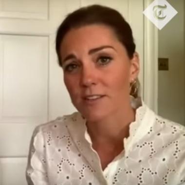 Lors d’une discussion avec les bénévoles de l’association Shout, la duchesse de Cambridge portait un cardigan signé Sandro. (15 mai 2020.)