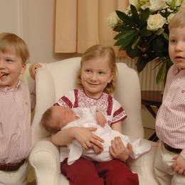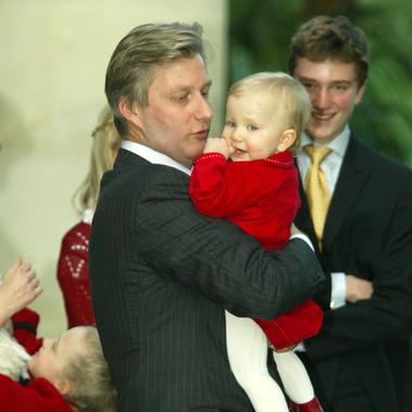 La princesse Élisabeth tient entre ses bras sa sœur Éléonore, entre ses deux frères Gabriel et Emmanuel. (Anderlecht, le 18 avril 2008.)