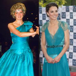 Les deux femmes ont toutes les deux cédé aux sirènes de la robe du soir turquoise. Pour la princesse Diana, ce sera lors d’un déplacement en Australie et pour la duchesse de Cambridge, à l’occasion d’un dîner de gala au Royal Albert Hall. (Australie, mars 1983 / Londres, le 11 mai 2012.)