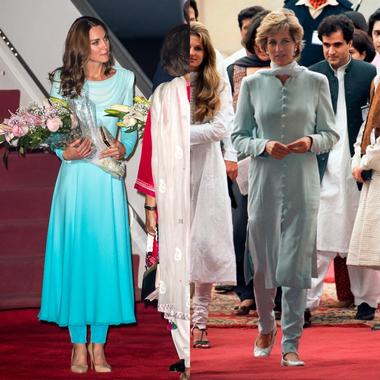 Pour se rendre au Pakistan, Kate Middleton arbore un ensemble signé Catherine Walker, griffe fétiche de Lady Diana. Dont la tenue officielle pour la même occasion ressemble fortement à celle portée par la duchessse. (Islamabad, le 14 octobre 2019/ Lahore, le 22 juin 1996.)