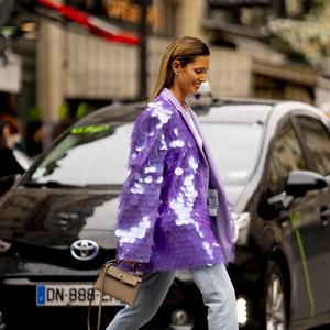 Helena Bordon scintille dans sa veste à sequins oversize Attico devant le show Giambattista Valli. (Paris, le 2 mars 2020.)