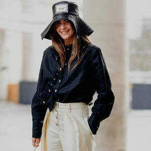 Clara Berry repérée aux abords du défilé Victoria Tomas au Palais de Tokyo avec un bob démesuré et une chemise noire oversize. (Paris, le 25 février 2020.)
