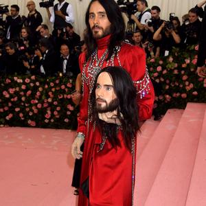 Jared Leto dans une robe rouge et sa double tête Gucci. (New York, le 6 mai 2019.)